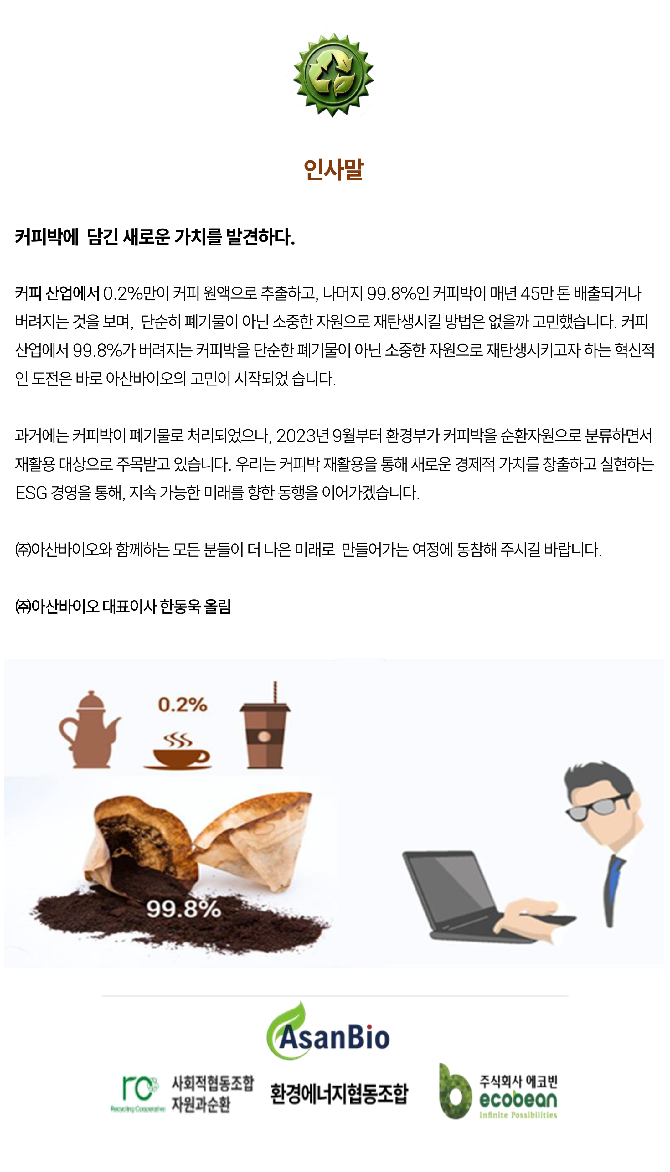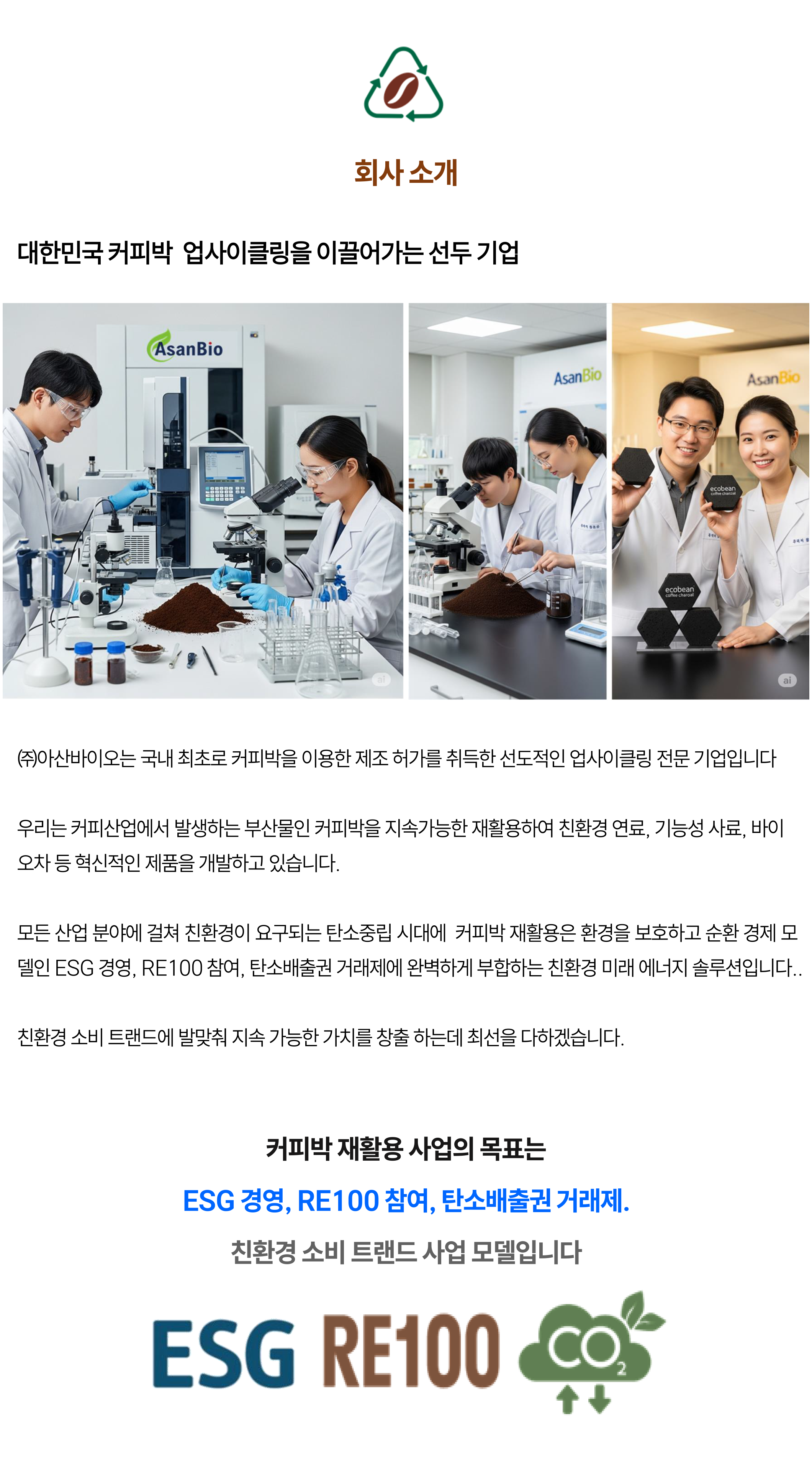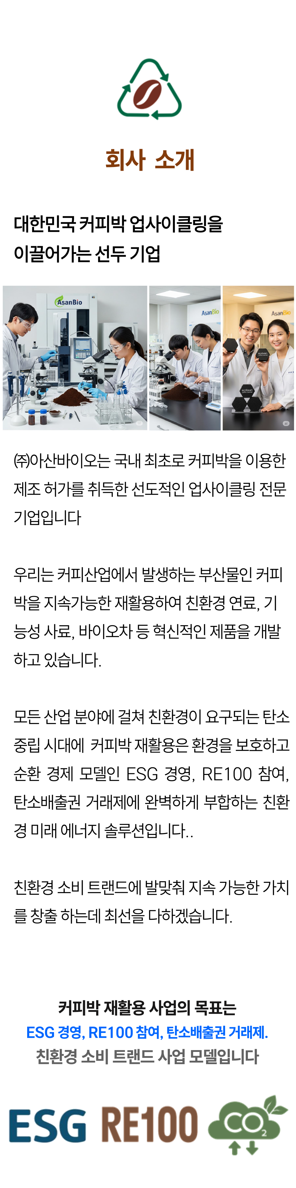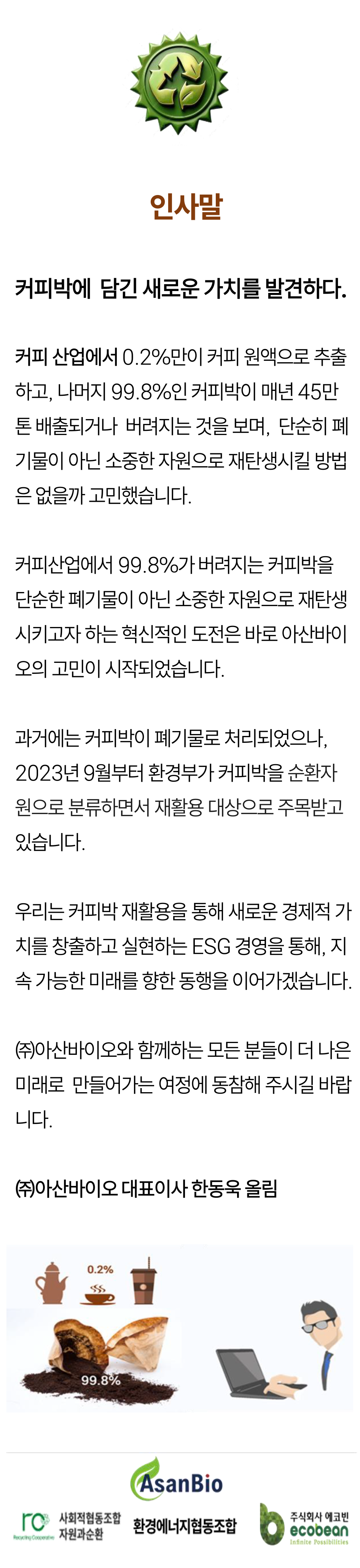 커피박으로 숯제조 허가를 최초로 취득한 대표적인 커피박 리사이클링 전문기업입니다.